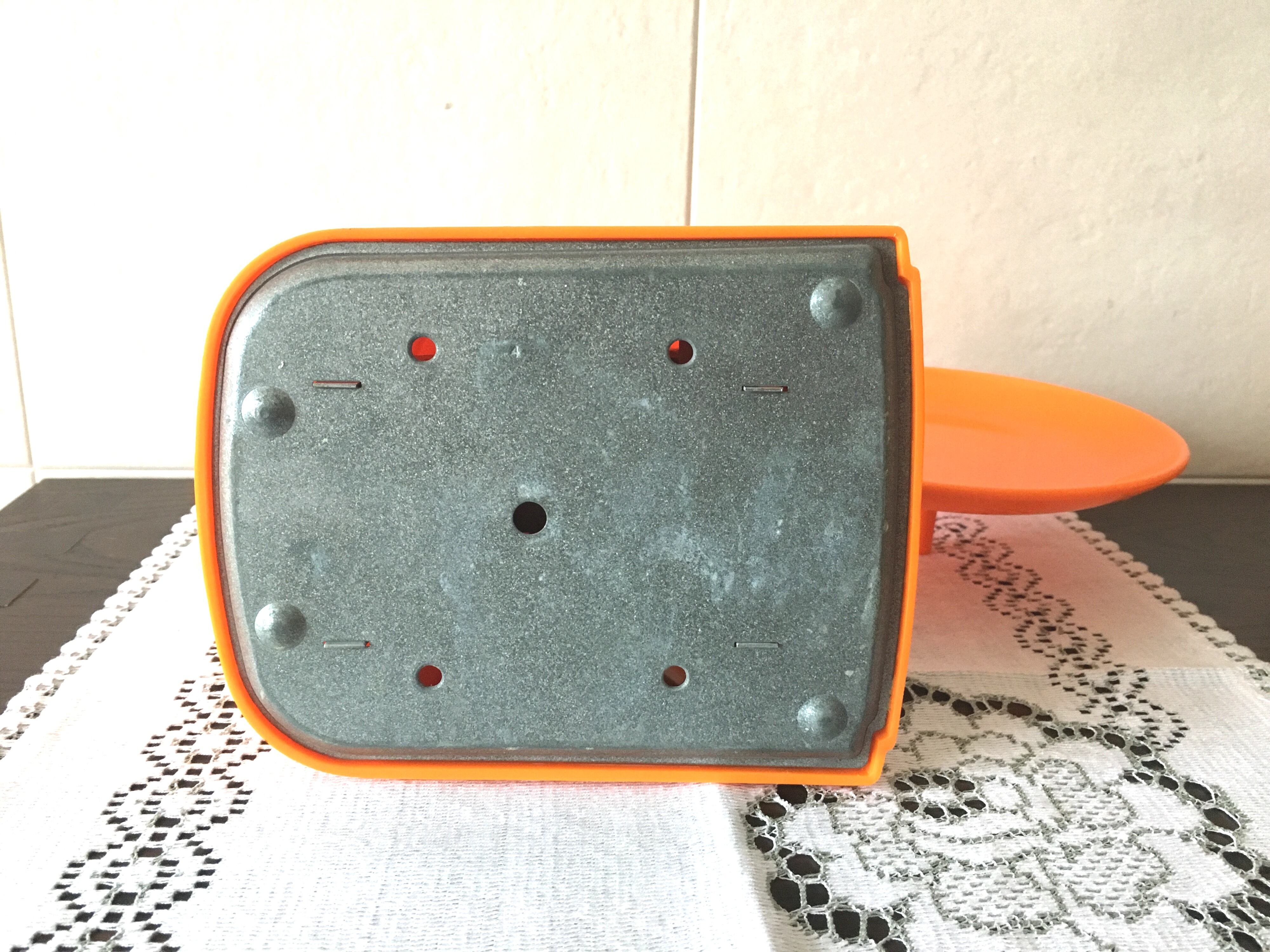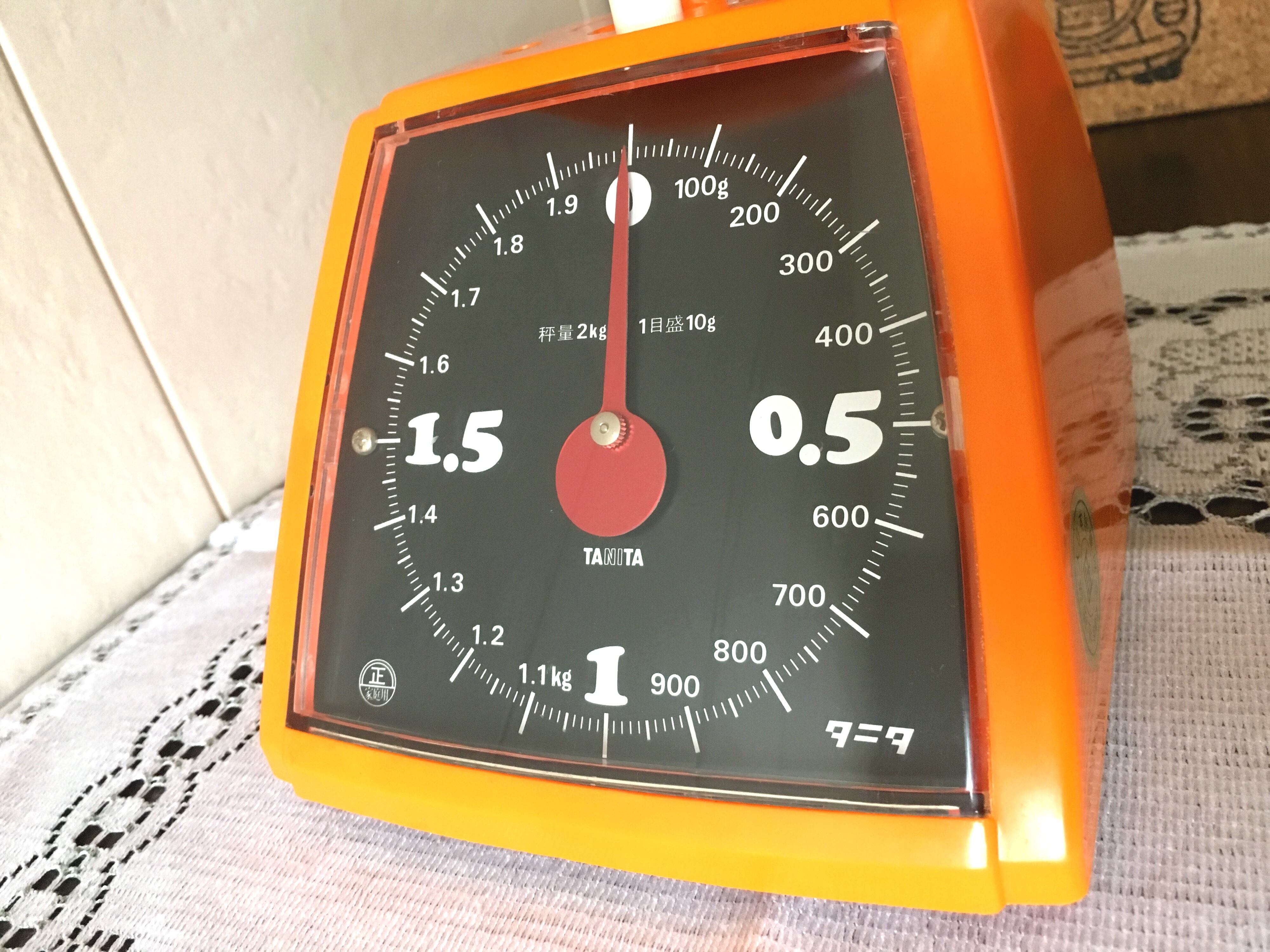 タニタ製のキッチンスケール、はかりです。色はオレンジで、レトロ可愛いお品です。2キロまで計測できるようになっています。細かな擦り跡、汚れ少しありますが、古いものとしては綺麗な状態です。もちろん、はかりとして機能しています。