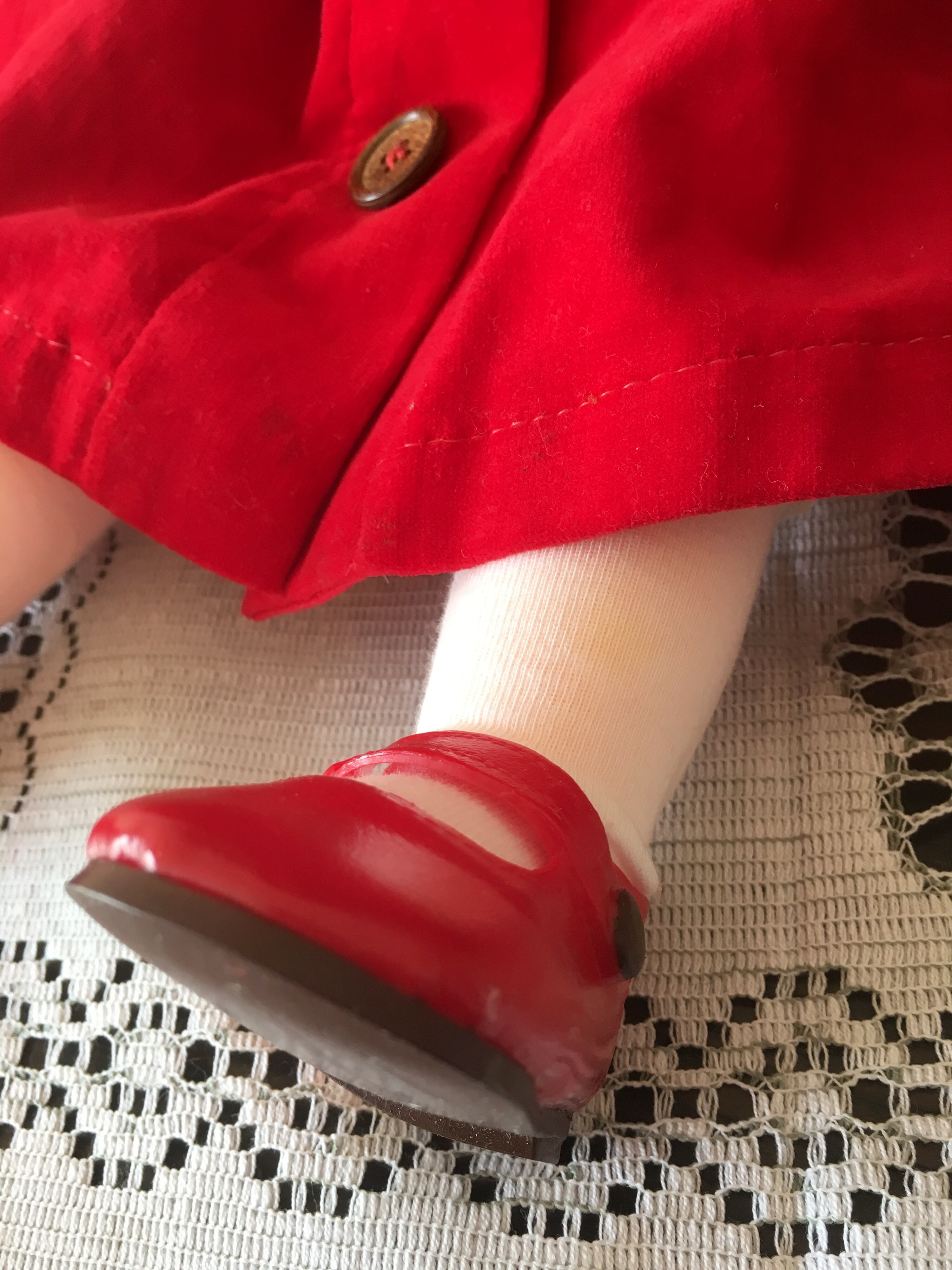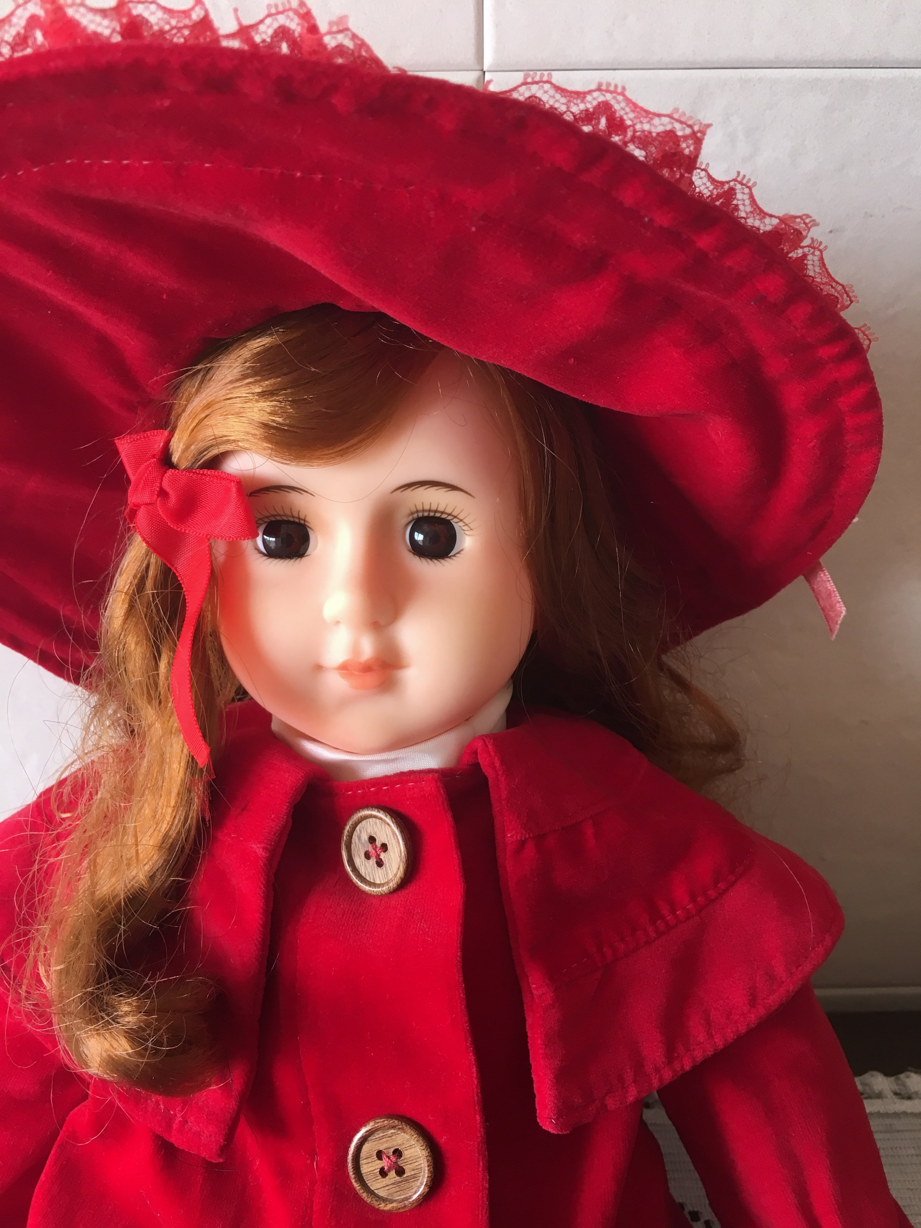 上品なお顔立ちです。洋服に色褪せ等はありませんが、赤い洋服部分、スカート後ろと右襟に少し汚れ、白いレース、お洋服部分に茶色いシミになっているところがあります。髪の毛は少しシットリした感じです。お顔は綺麗です。