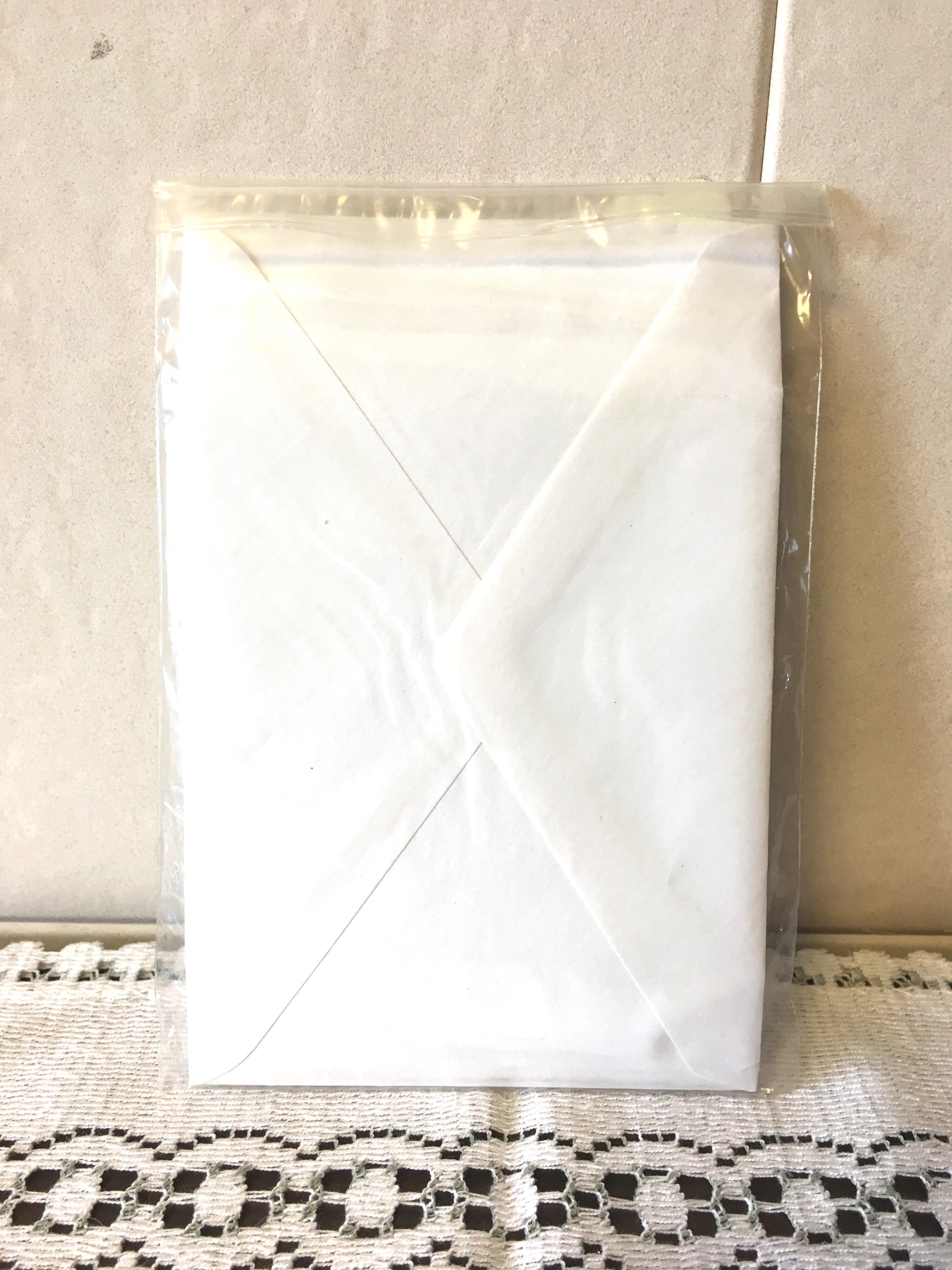 封筒はシンプルな白い封筒です。少しカードより高さがある部分、保管により前のめりになった感じの状態になっておりますので、お含みおき下さい。