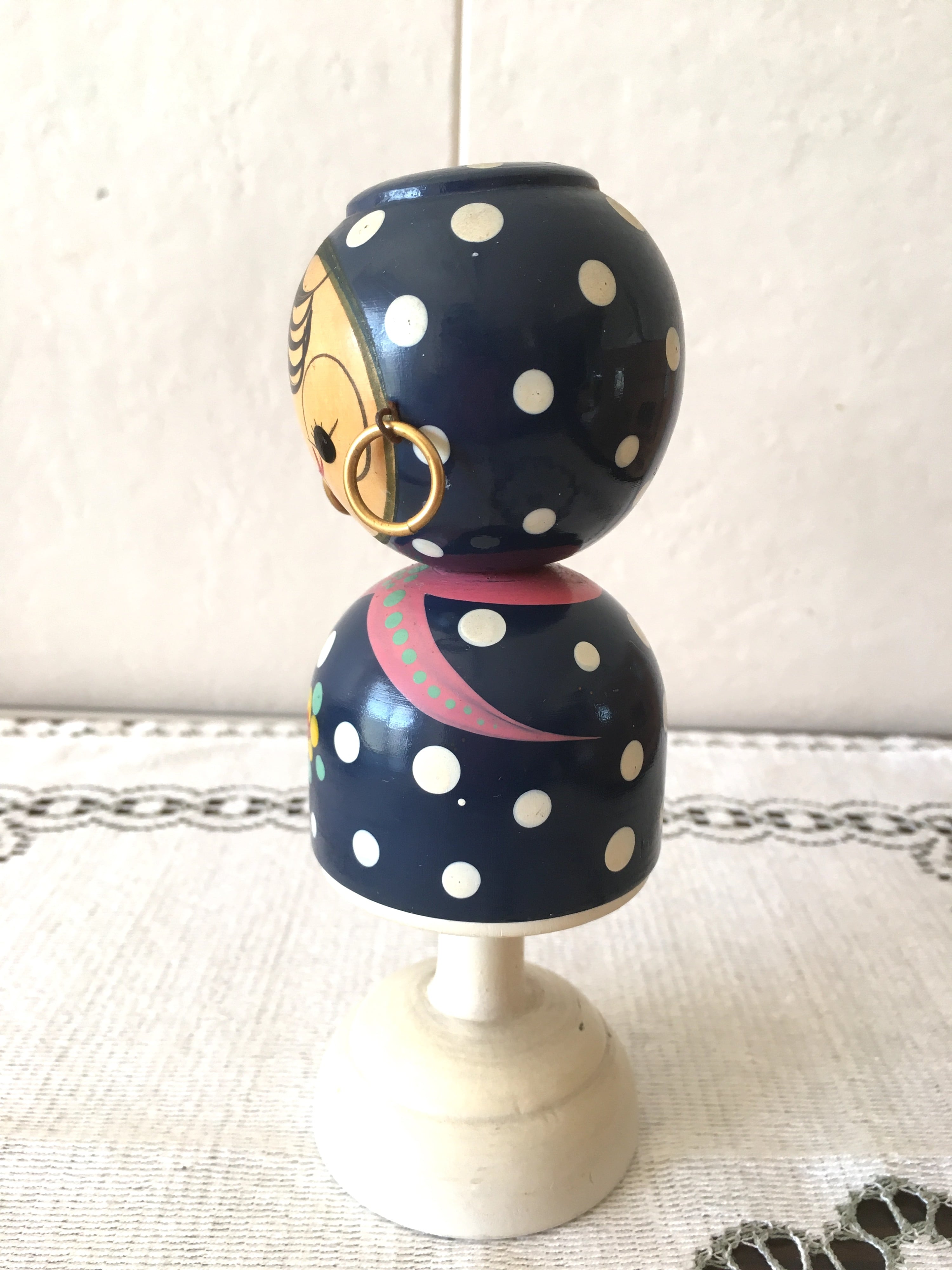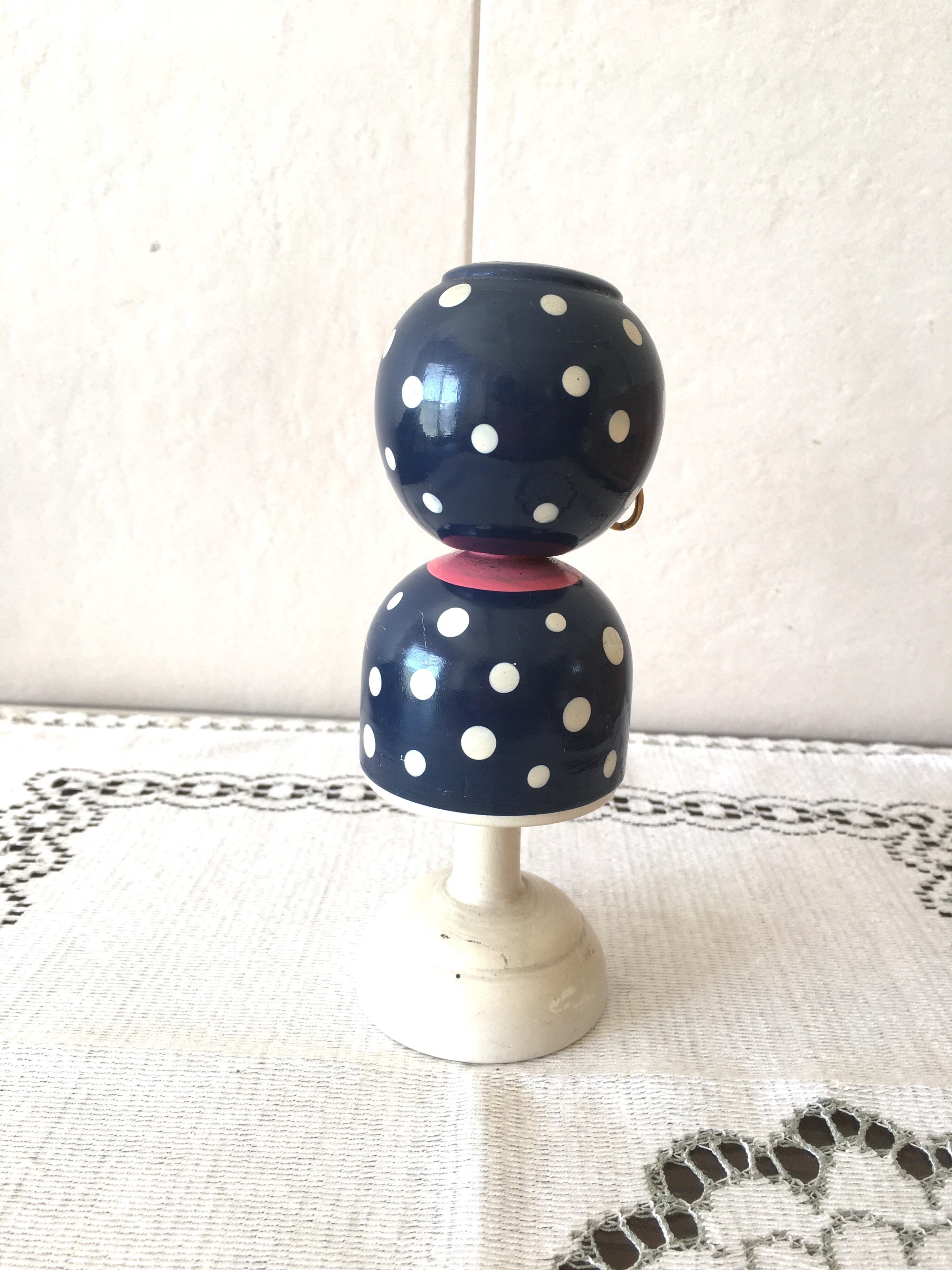 お顔は民藝風ですが、お洋服やフォルムが北欧風でとっても可愛い首振りタイプのこけしです。