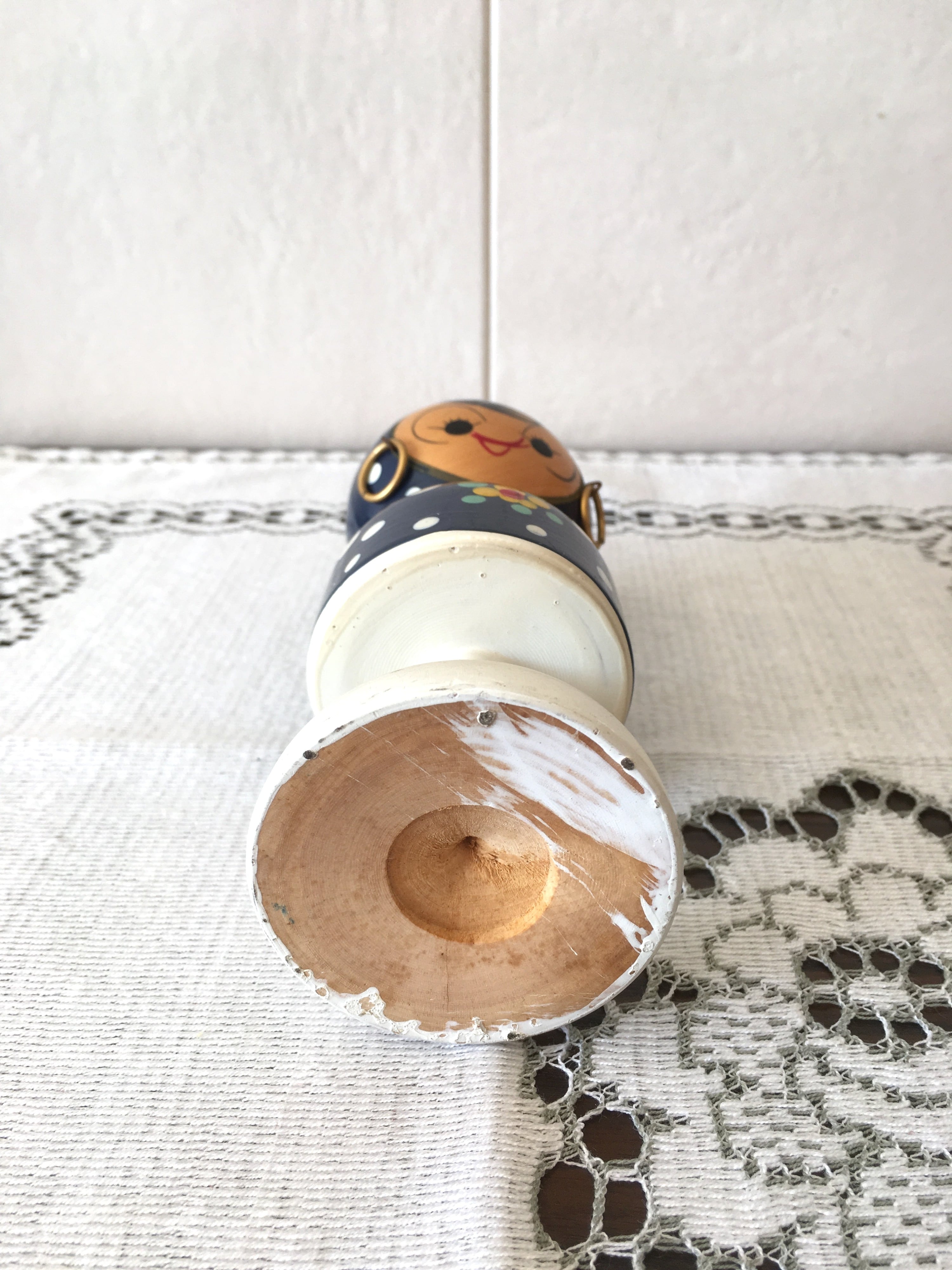 白の台座部分に少し汚れ、頭上部と体後ろに塗装の塗りムラによる線等があります。木製のこけし本体にヒビ、欠けはなく、古いものとしては状態は良いと思います。