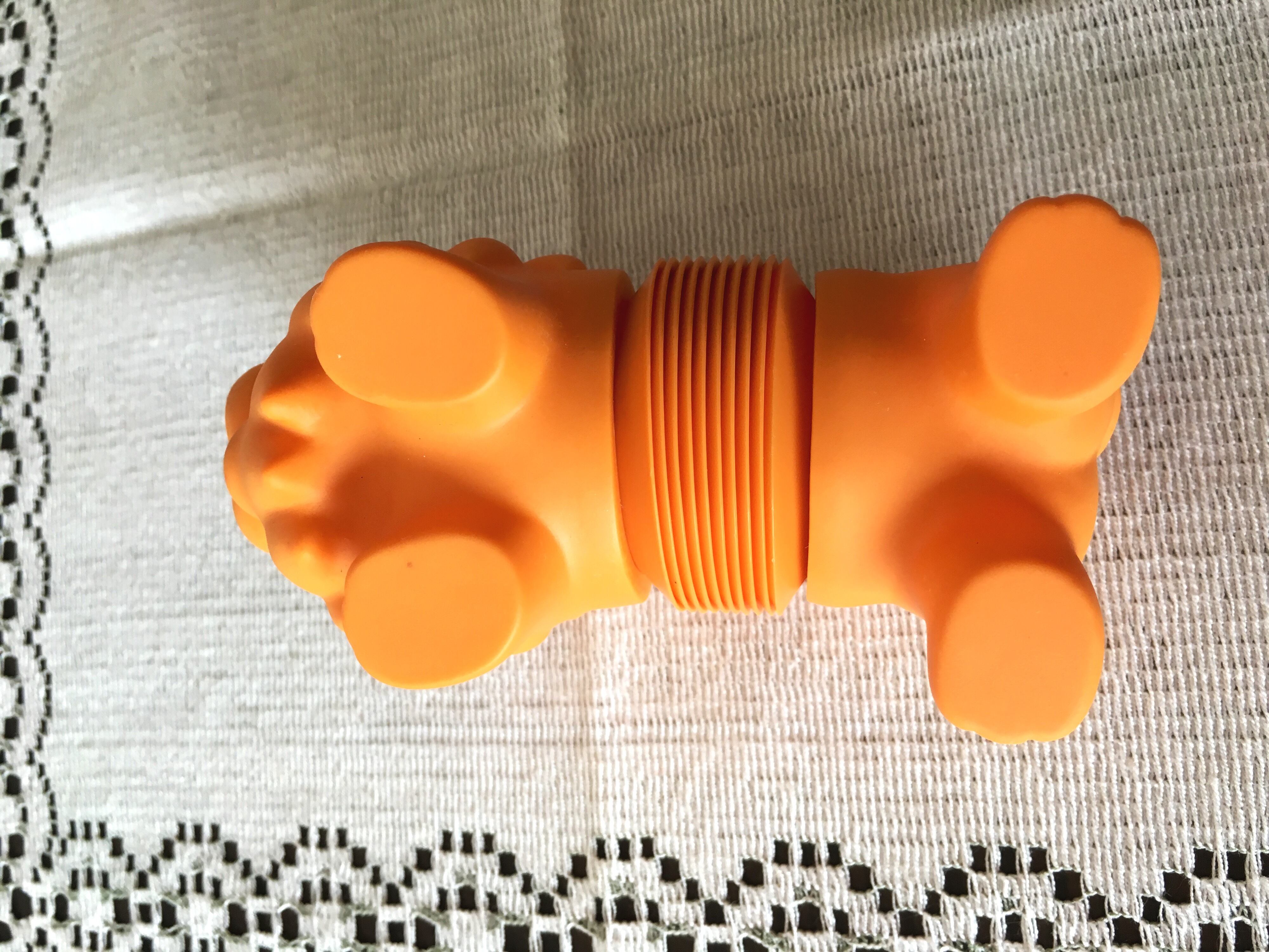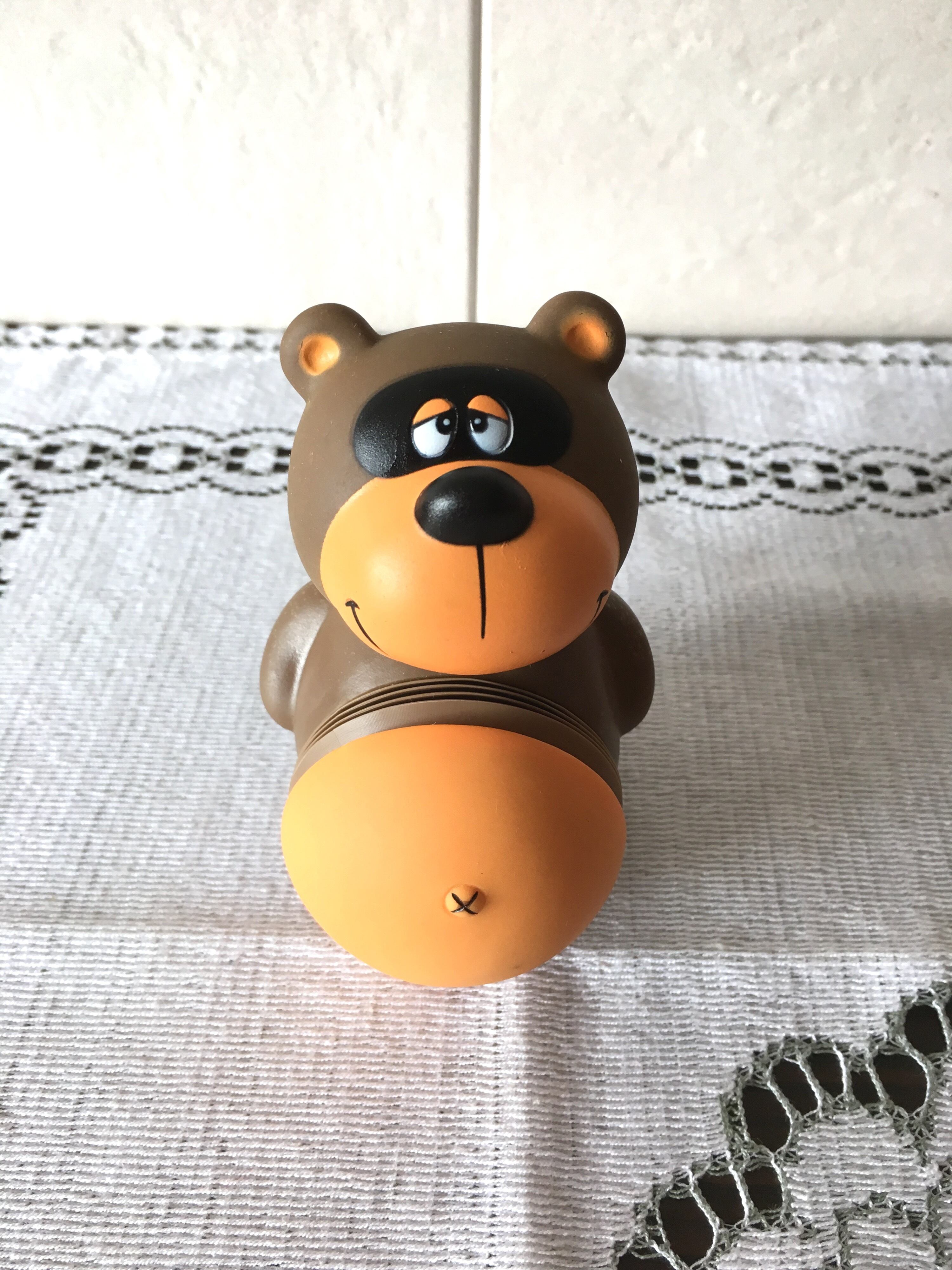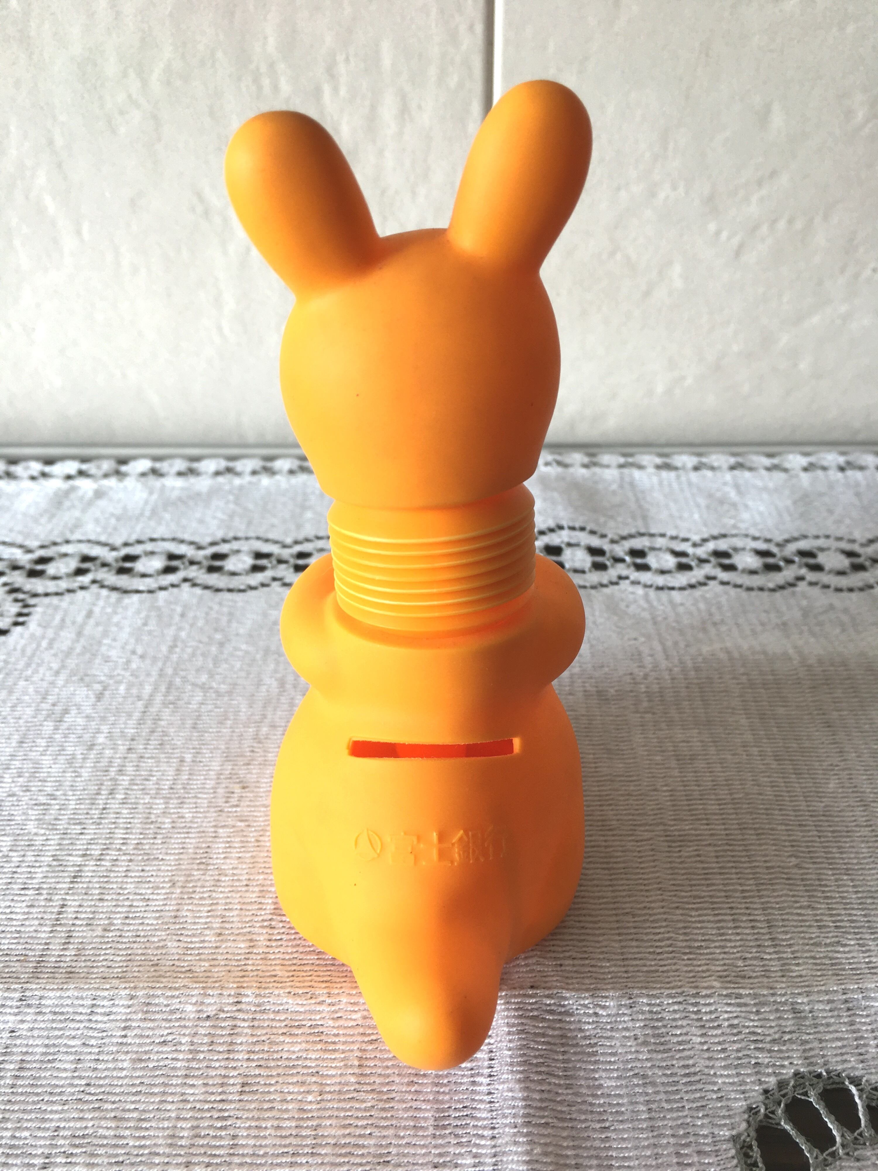 体の一部がジャバラ折りになっていて、お金がいっぱいになると伸ばしてもっと貯金できるようになっている、ユーモラスな貯金箱です。