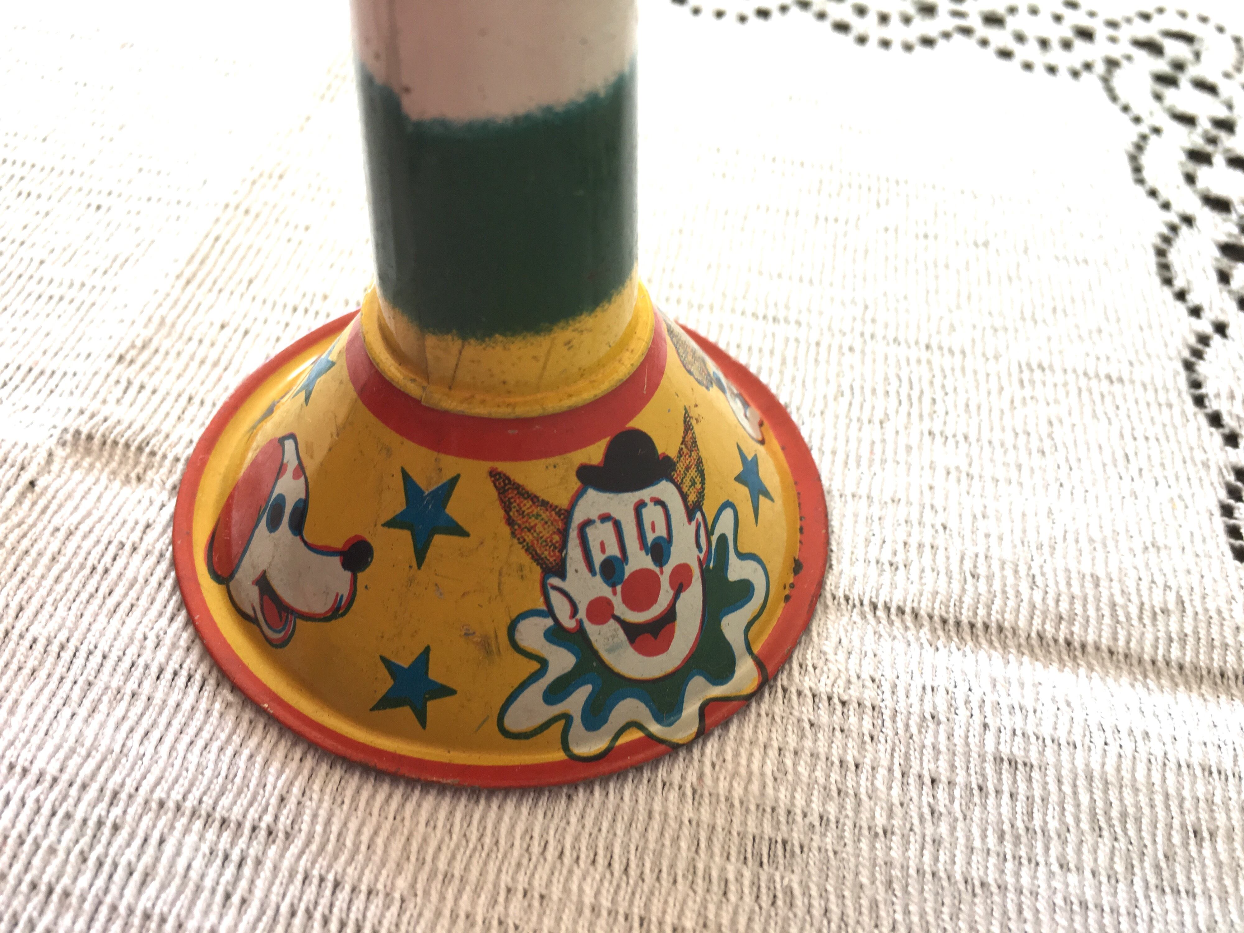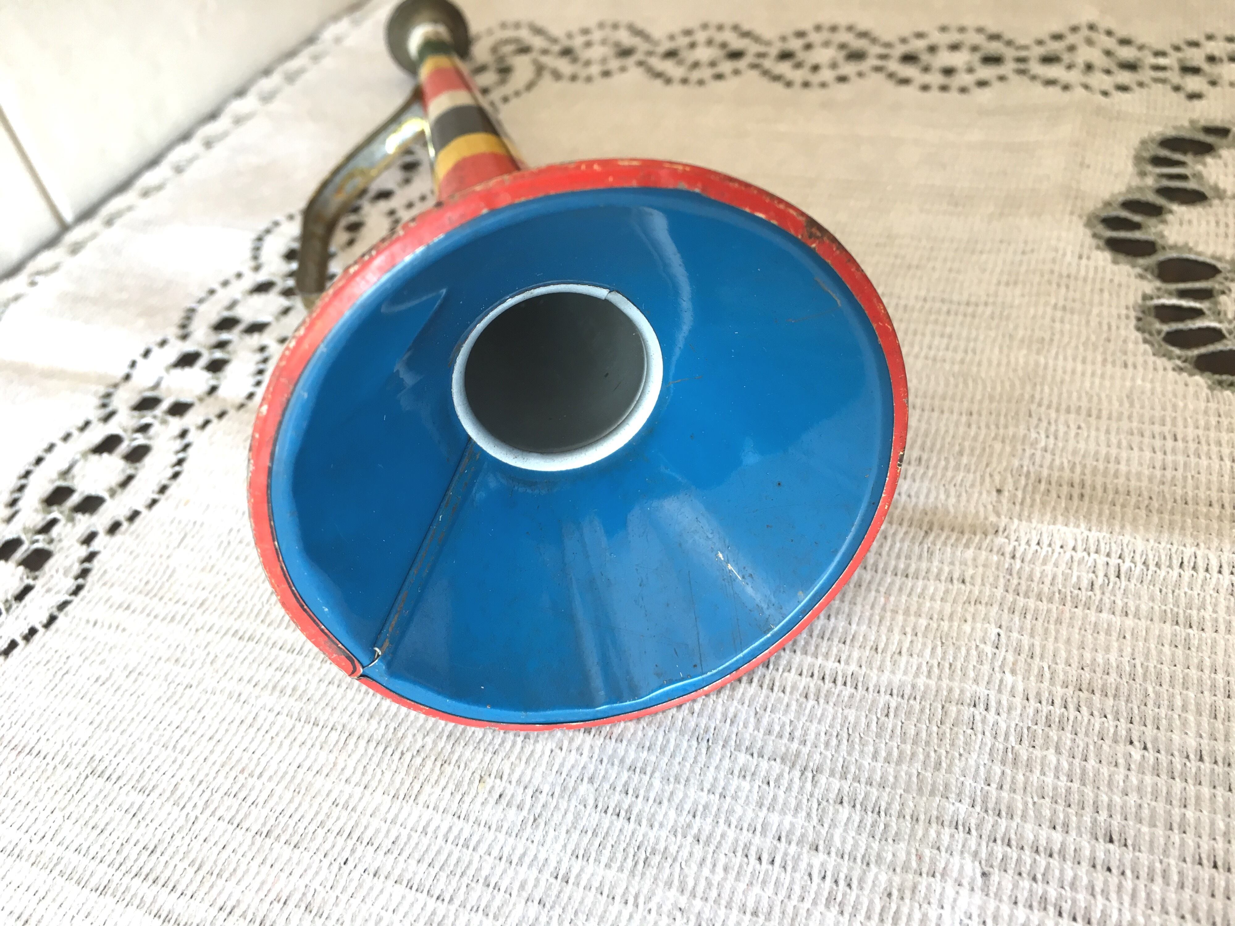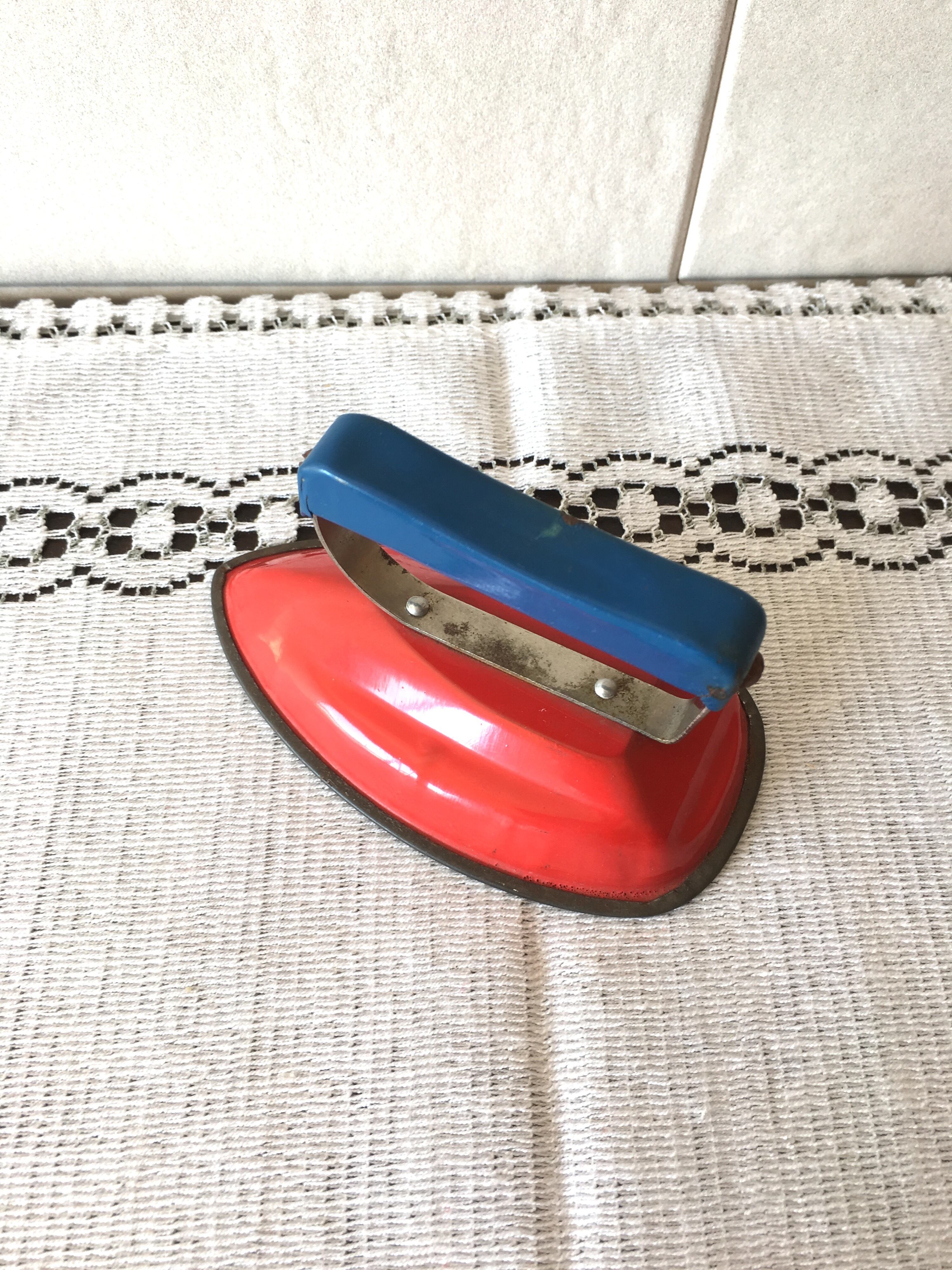 ブリキ製の太鼓とラッパ、アイロンのおもちゃのセットです。太鼓は貯金箱になっており、バチのみプラスチック製です。