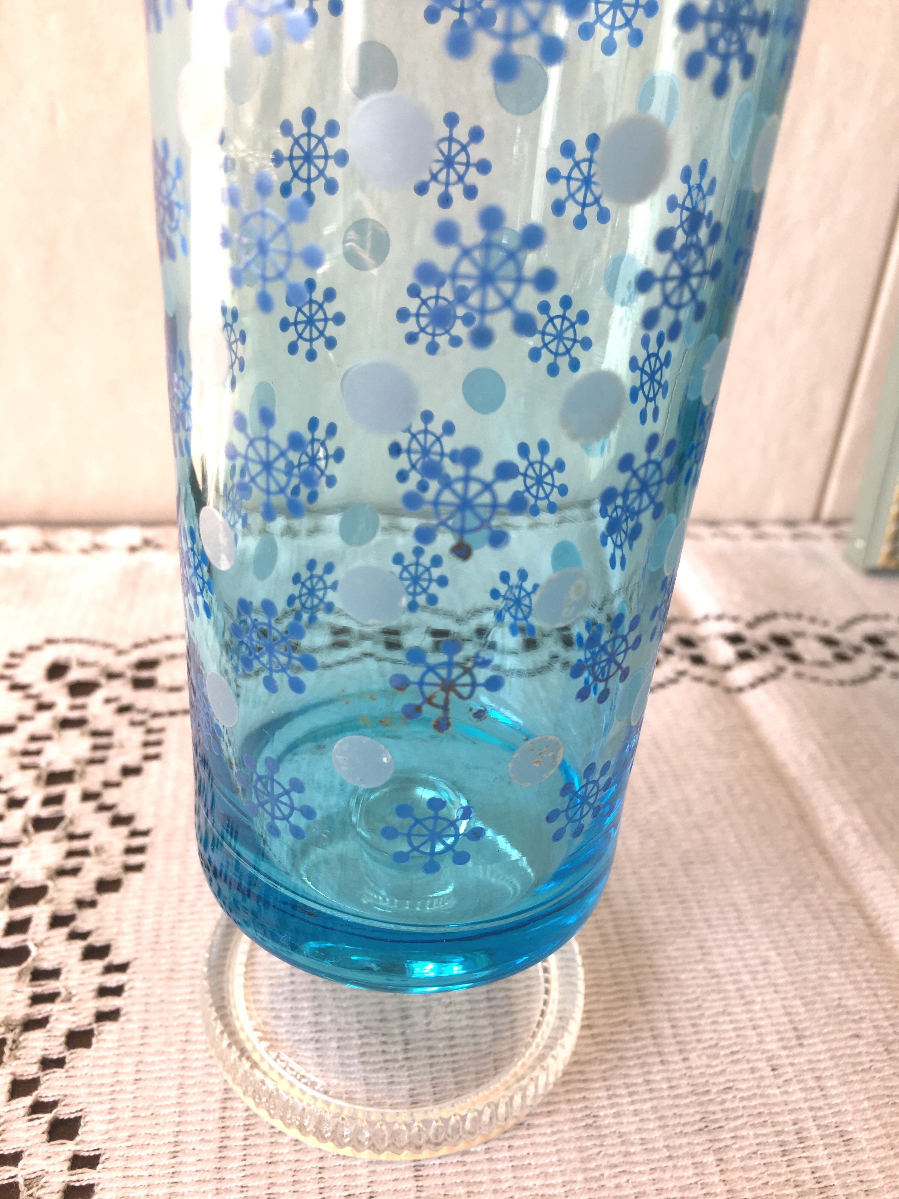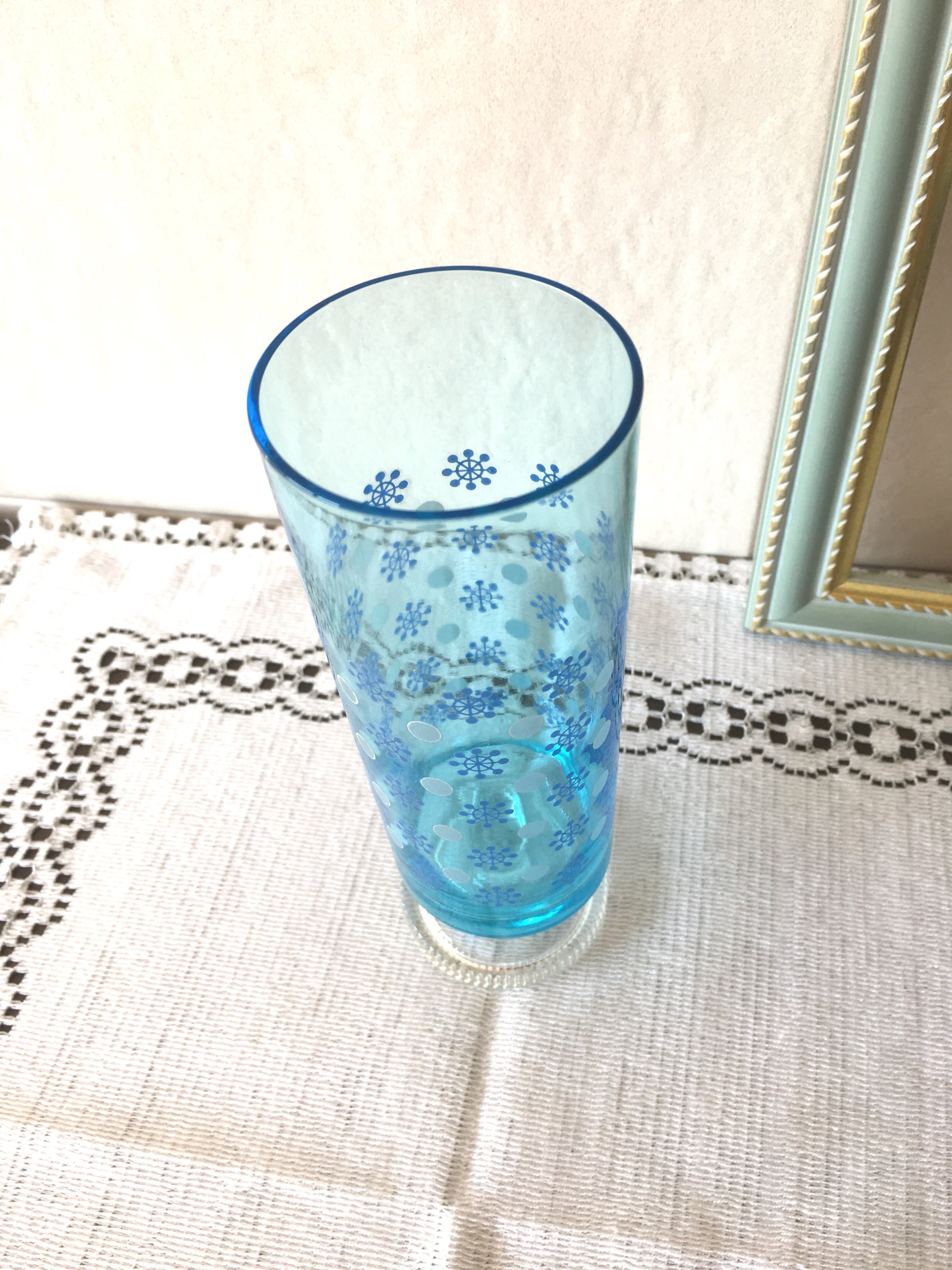 水色のグラスに雪の結晶のデザインがとても可愛いです。脚の土台部分にも細かい装飾が施され華やかです。