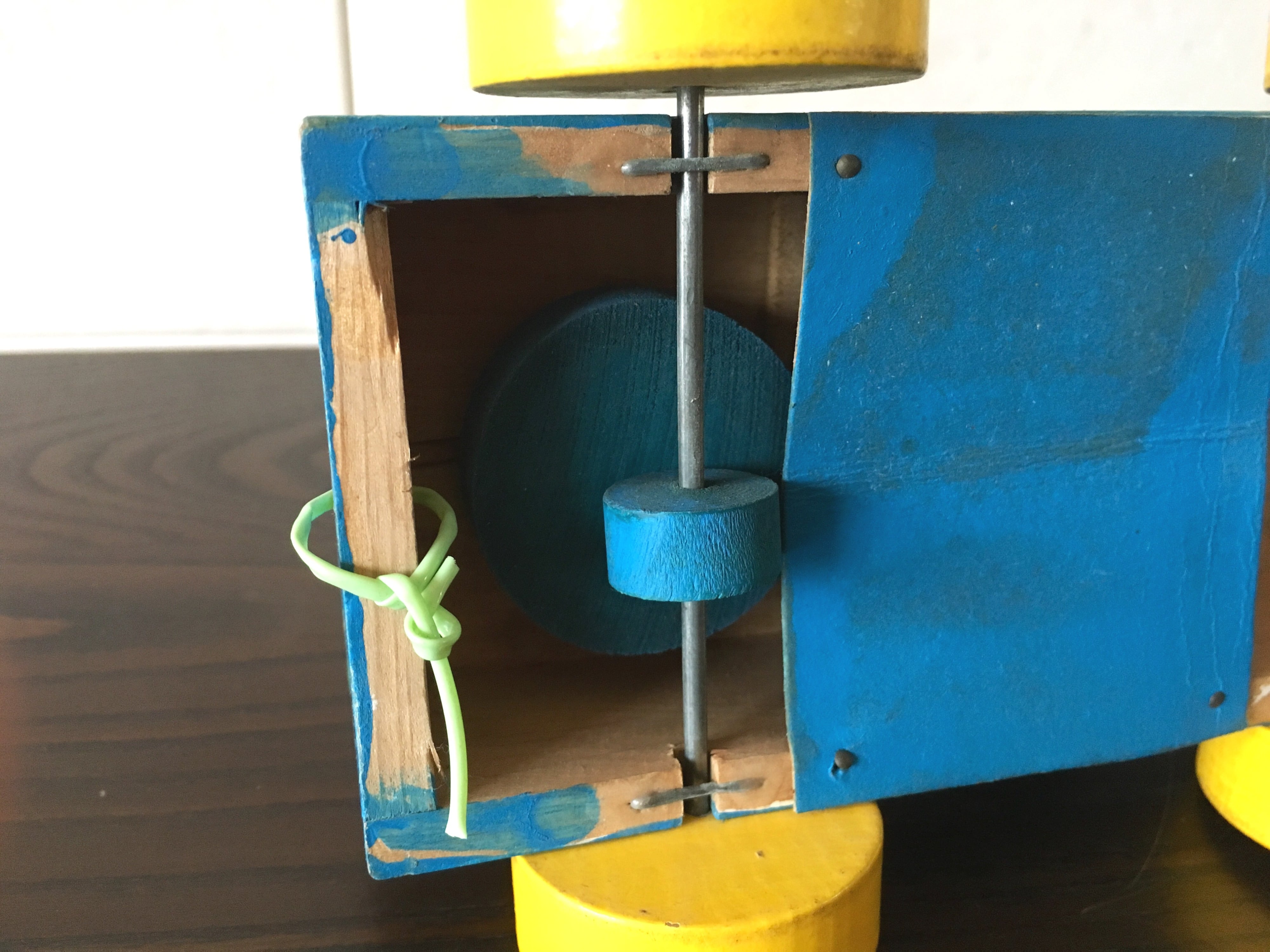 木の車輪が回転すると前輪部分、赤の水玉の円柱がクルクル回り、後輪部分はアヒルの首が左右し、裏側の細い針金が弾かれることにより、ガァガァと鳴き声がするようなカラクリとなっており、良く考えられた、感心させられるつくりになっています。