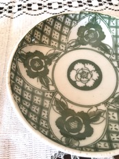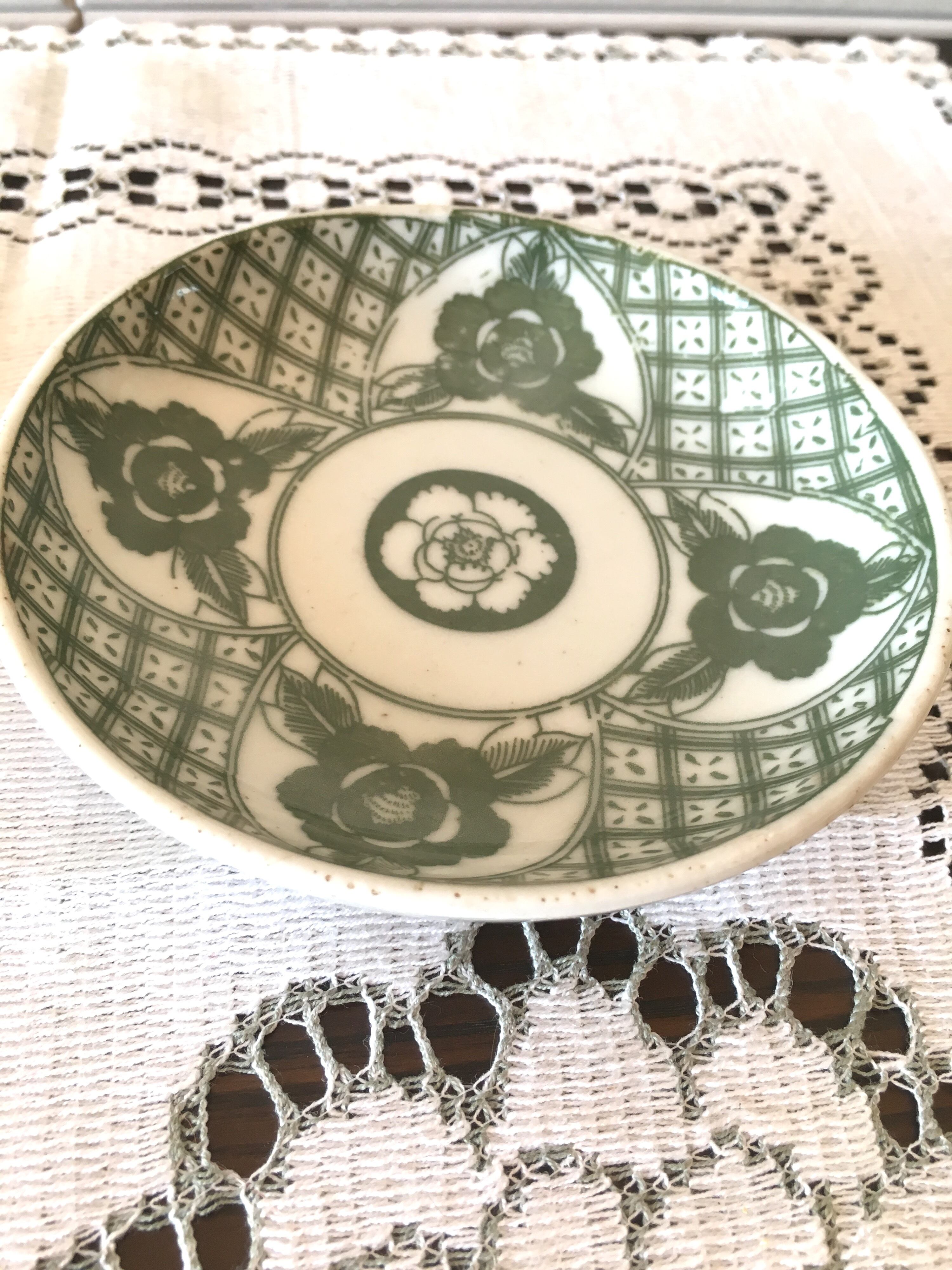 抹茶グリーンの色合いと、ハイカラさを感じるデザインが素敵な小皿、2枚セットです。