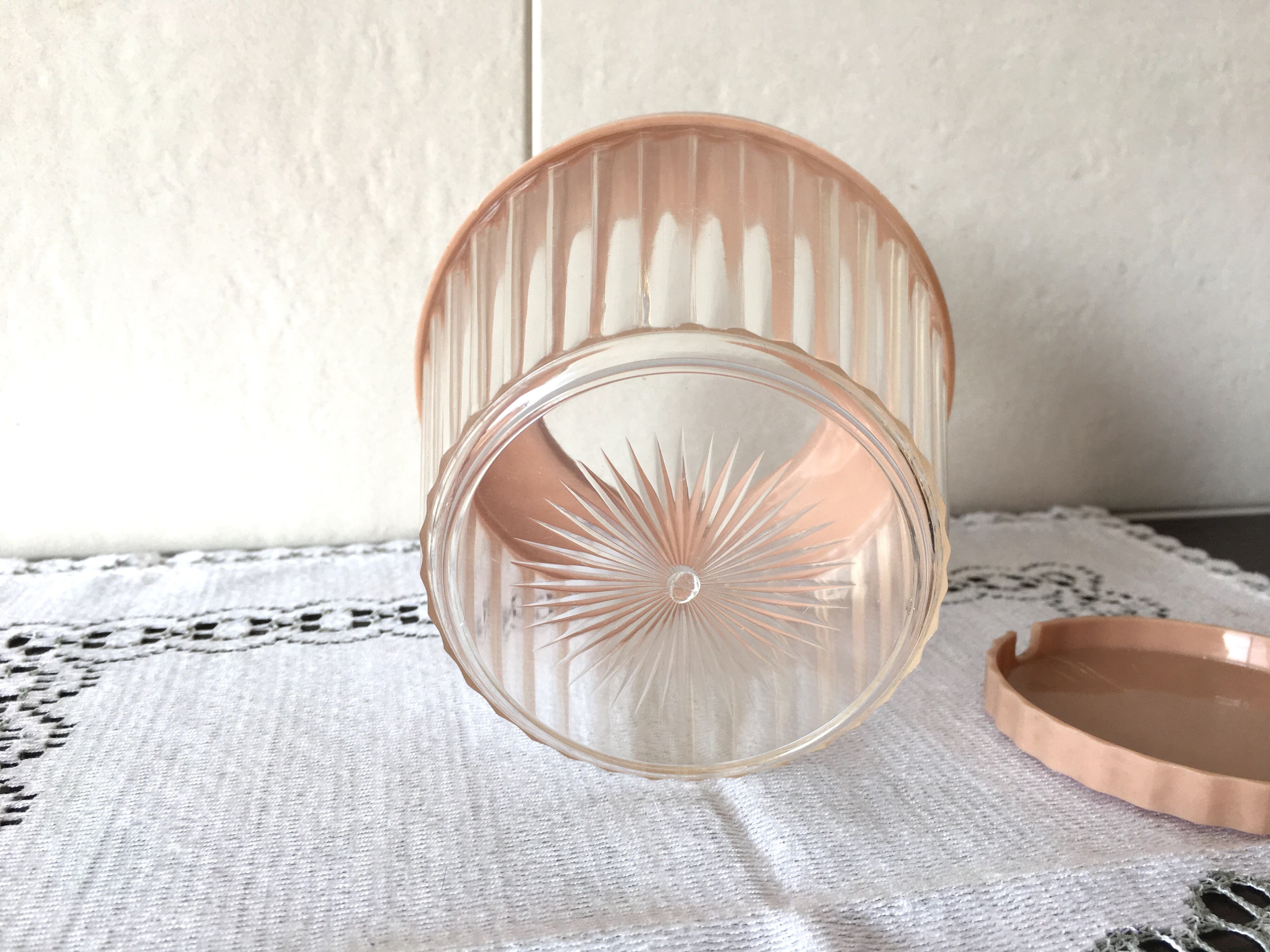 側面の波カットに底部分のお花のようなカットが美しい、プラスチック製のシュガーポットです。