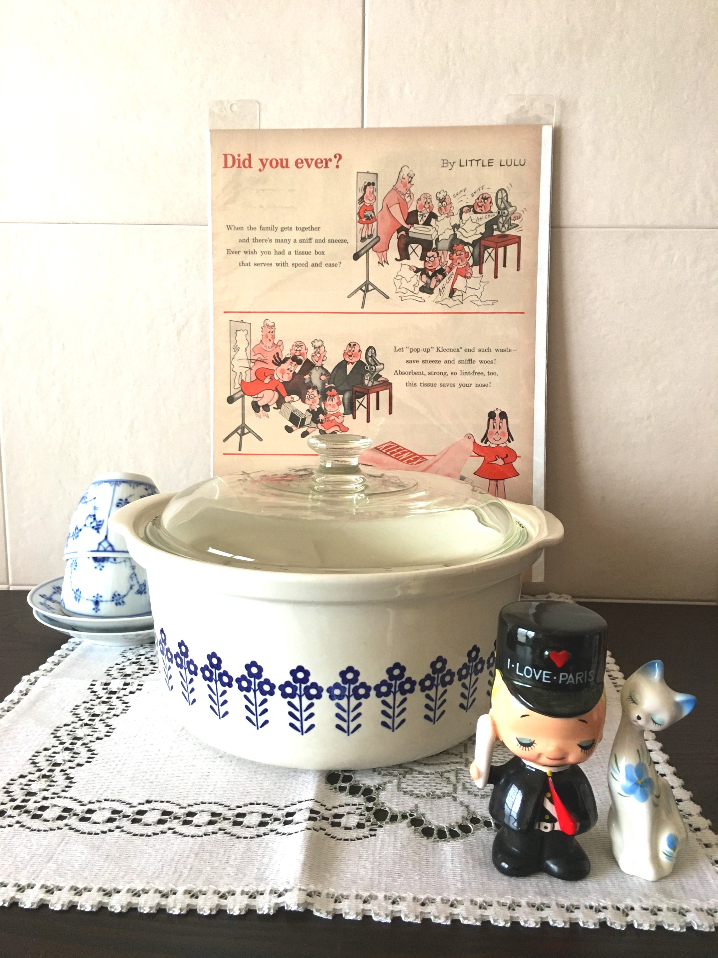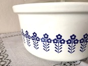 ブルーの小花柄が可愛い、陶器製のキャセロール(鍋)です。