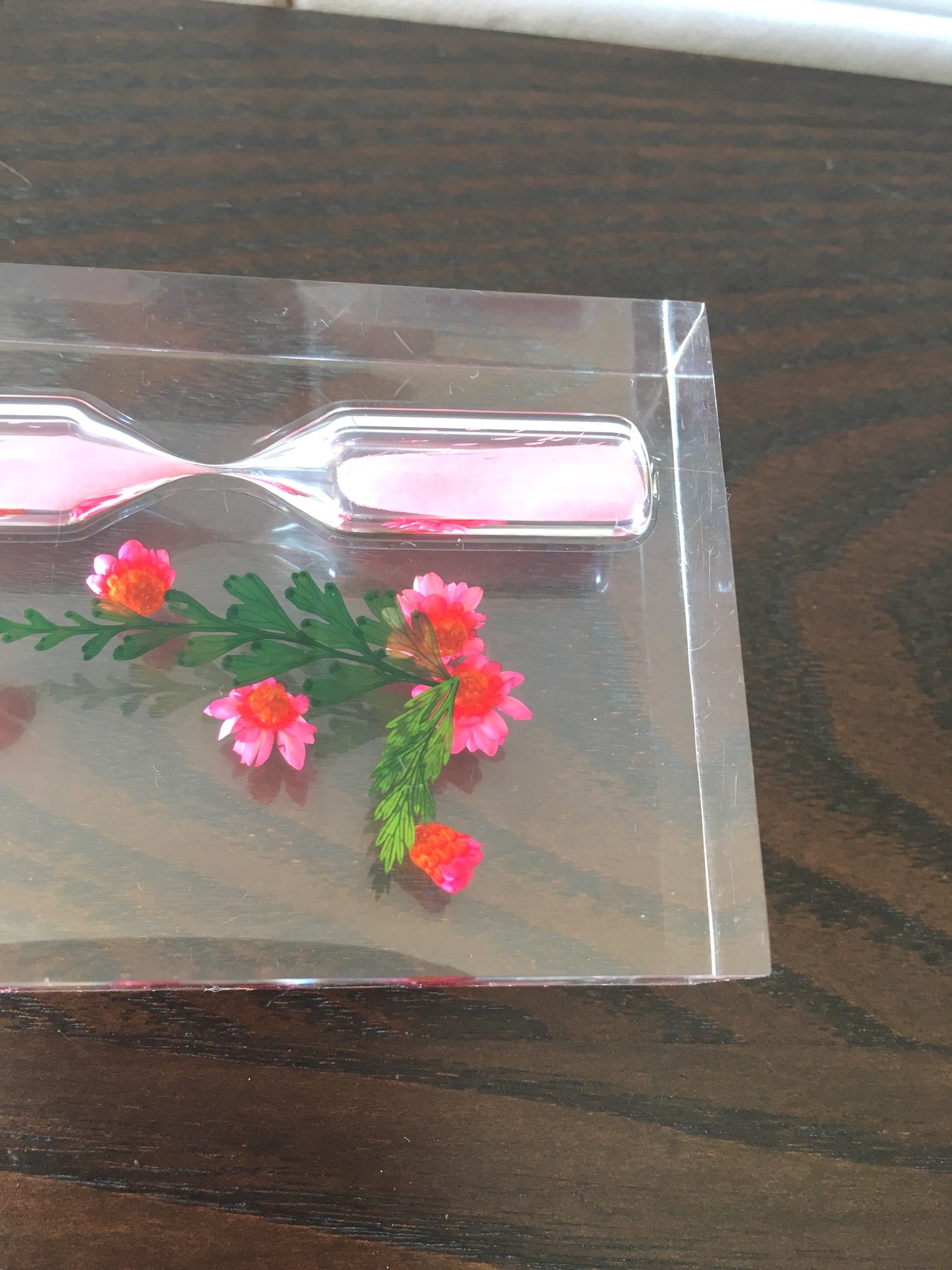 透明なプラスチック樹脂の中に造花と砂時計が埋め込まれた、懐かしいお品です。